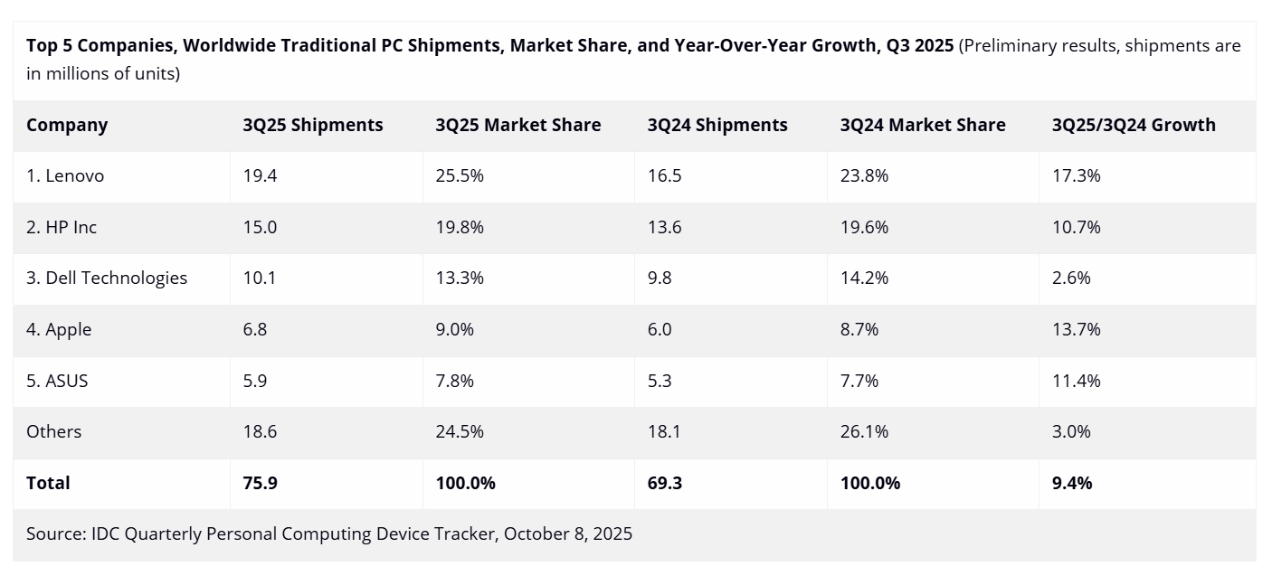 Lenovo üçüncü çeyrekte %25,5 pazar payıyla liderliğini korudu ve yıllık bazda %17,3 büyüme gösterdi. Lenovo’yu, %19,8 payla HP ve %13.3 ile Dell takip etti. Satışlarını %13,7 arttıran Apple ise %6,8 pay elde ederek dördüncü sıradaki yerini korudu.